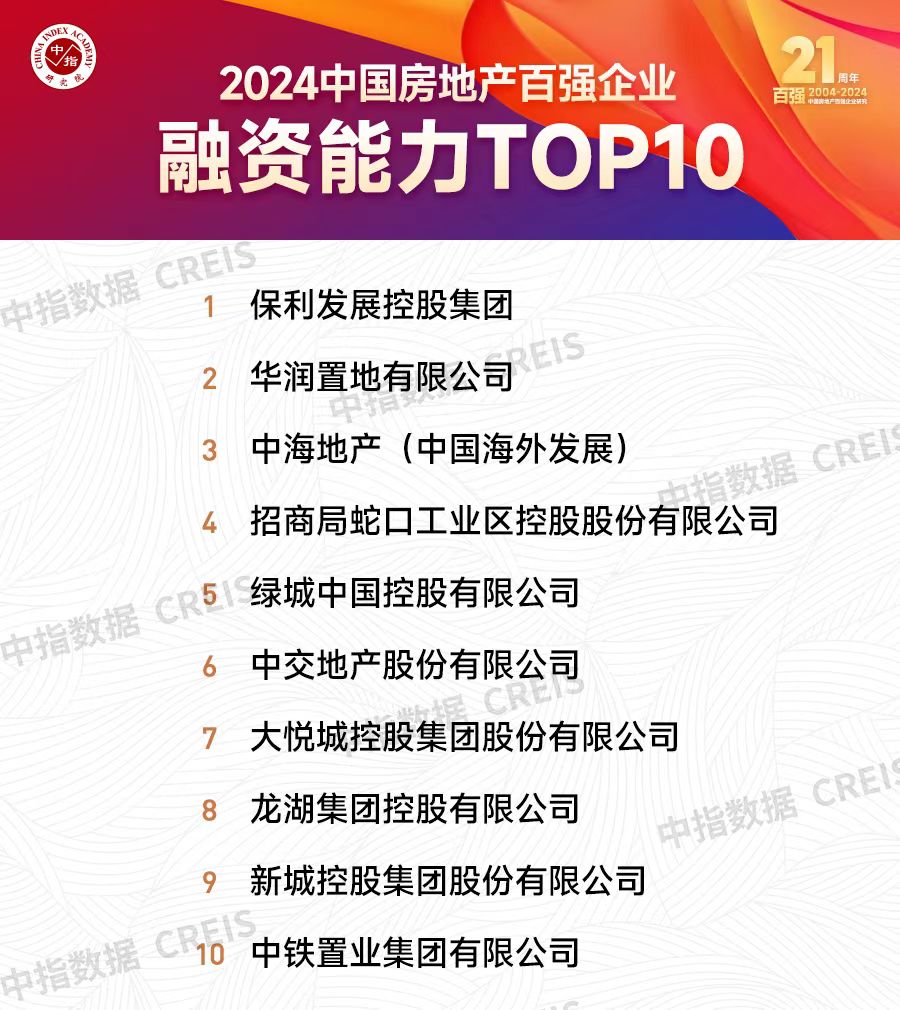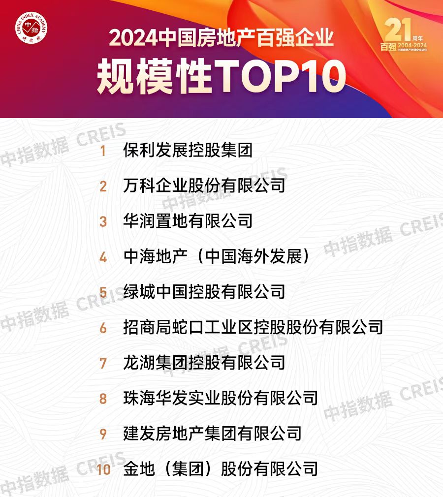3月21日,中指研究院发布2024中国房地产百强企业研究报告。报告中,以综合实力、规模性及盈利性等七大维度对TOP10房企作出最新排行。