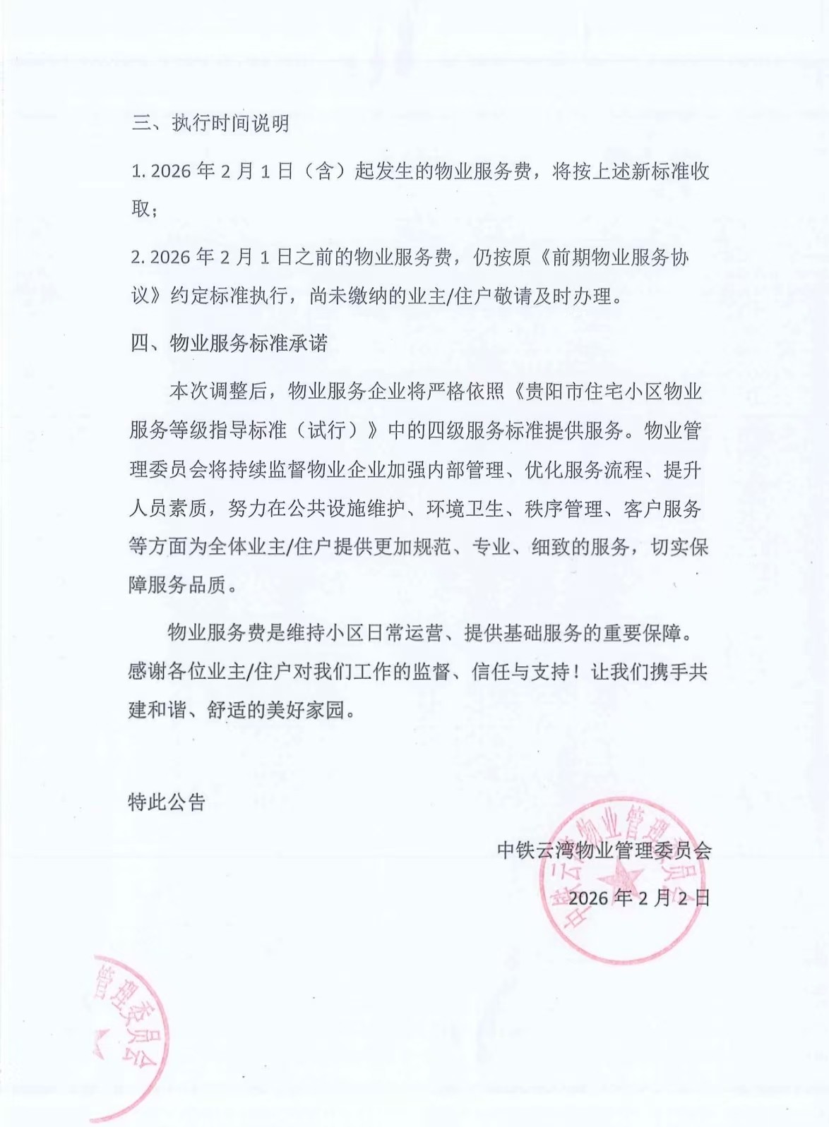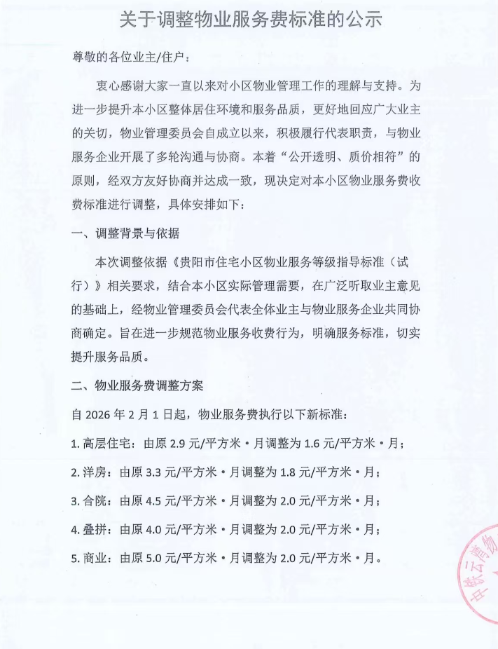 据了解,此次调整依据《贵阳市住宅小区物业服务等级指导标准(试行)》相关要求,经物业管理委员会与物业服务企业多轮协商达成。物业方承诺将严格依照四级服务标准,提升公共设施维护、环境卫生、秩序管理等服务质量。