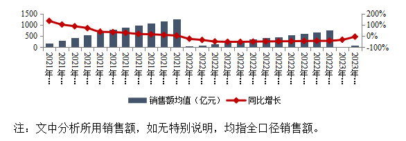 图:2021年至2023年1-2月TOP100房企累计销售额及增速情况
