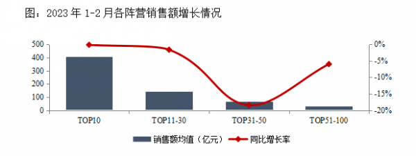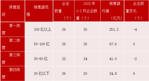 2023年1-2月,第四阵营企业数量增加。具体来看,百亿以上阵营26家,较去年同期减少4家,为四个阵营中数量减少最多阵营,销售额均值251.2亿元。第二阵营(50-100亿)企业26家,较去年同期持平,销售额均值67.6亿元。第三阵营(30-50亿)企业22家,较去年同期减少2家,销售额均值41.0亿元。第四阵营(30亿以下)企业为26家,较去年同期增加6家,销售额均值24.8亿元。