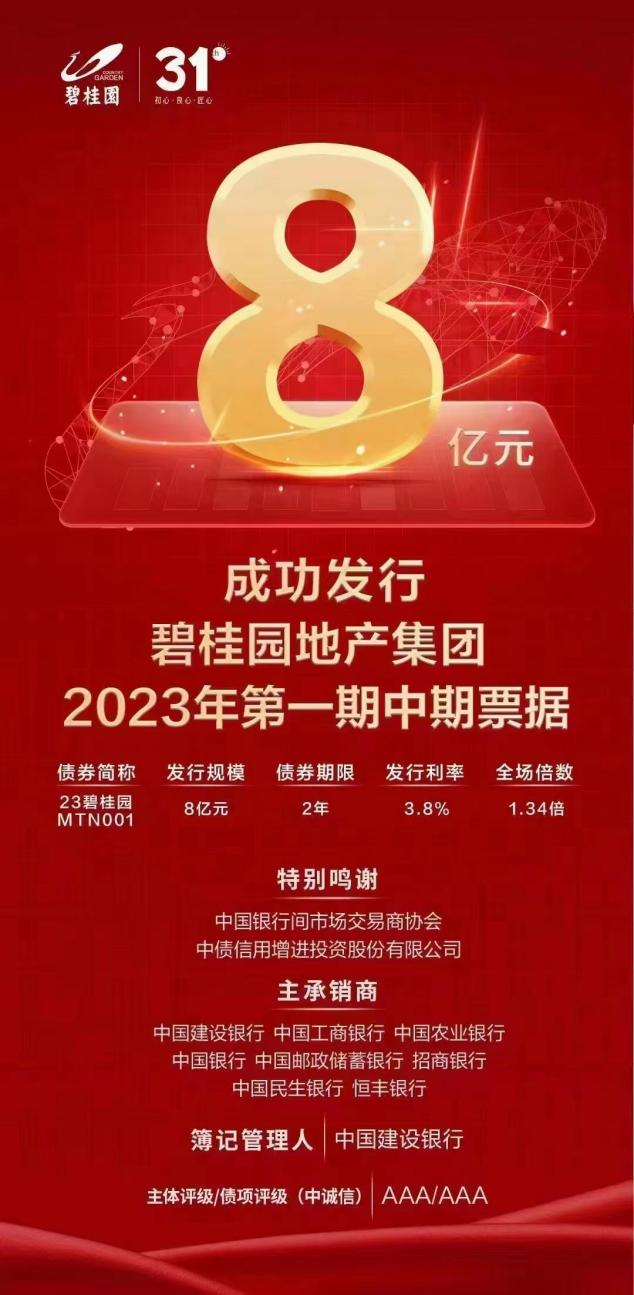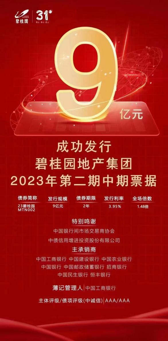近日,碧桂园集团对外发布宣传海报,碧桂园地产成功发行2023年第一期中期票据8亿元和第二期中期票据9亿元,共17亿元,主体及债项评级为AAA。