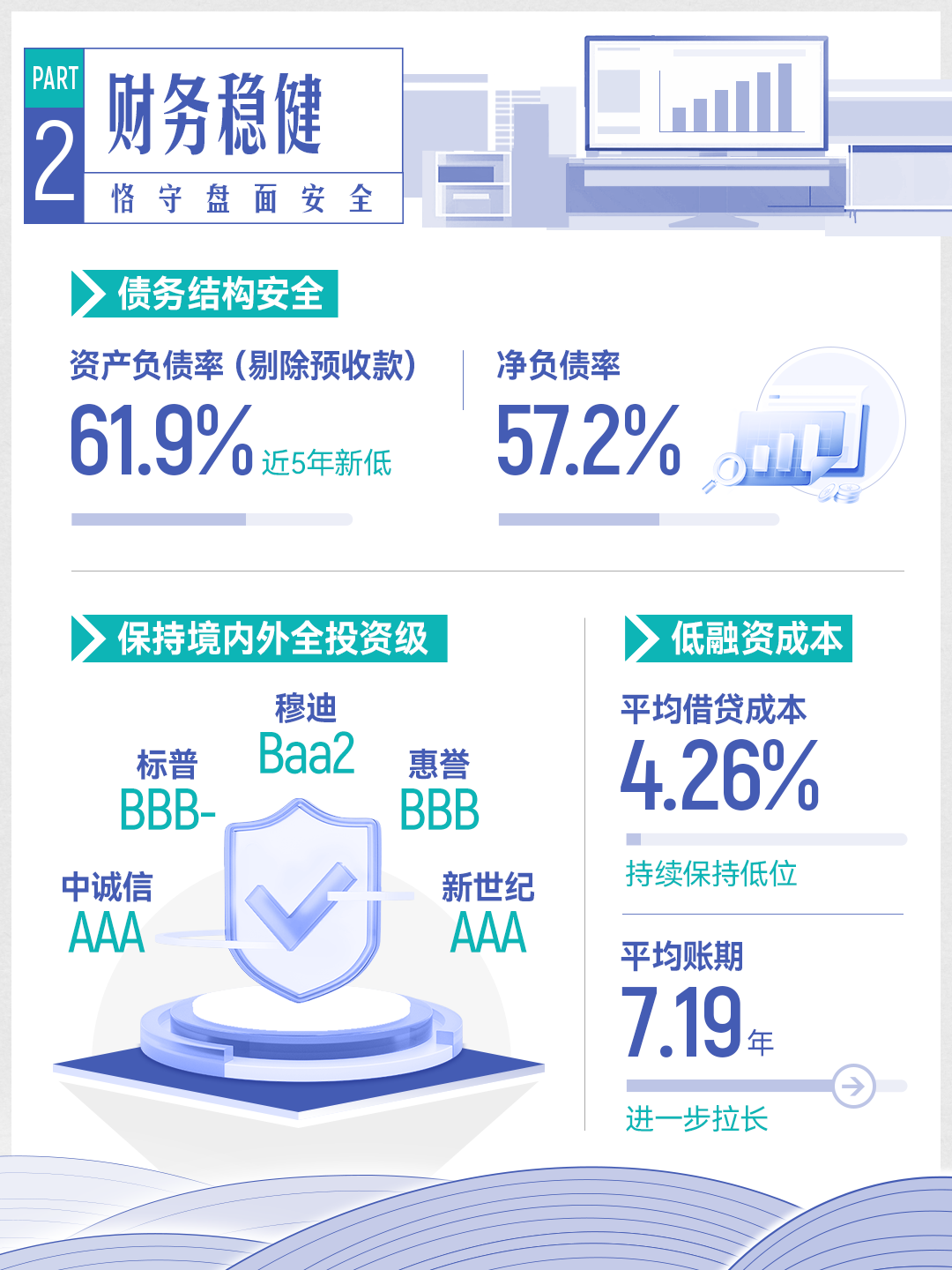 如今,龙湖坚持开发、运营及服务三大板块协同发力,“1+2+2”的业务格局继续深化,运营及服务利润占比不断提高,经营性现金流为正,有息负债稳步下降,资产质量持续优化提升。